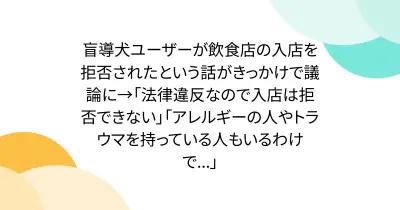 盲導犬ユーザーが飲食店の入店を拒否されたという話がきっかけで議論に→「法律違反なので入店は拒否できない」「アレルギーの人やトラウマを持っている人もいるわけで...」