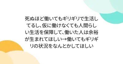 死ぬほど働いてもギリギリで生活してるし、仮に働けなくても人間らしい生活を保障して、働いた人は余裕が生まれてほしい→働いてもギリギリの状況をなんとかしてほしい