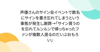 声優さんのサイン会イベントで数名にサインを書き忘れてしまうという事態が発生し謝罪→「サイン貰うのを忘れてルンルンで帰っちゃったファンが複数人居るのだいぶおもろい」