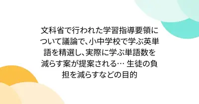 文科省で行われた学習指導要領について議論で、小中学校で学ぶ英単語を精選し、実際に学ぶ単語数を減らす案が提案される… 生徒の負担を減らすなどの目的