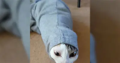 人間の服に詰まってる猫をちゅーるで誘ったらこのスタイルのまま舌を伸ばしてきて限界だった「新種の生き物だ」
