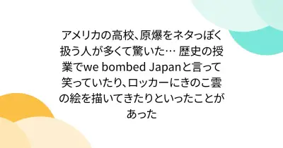 アメリカの高校、原爆をネタっぽく扱う人が多くて驚いた… 歴史の授業でwe bombed Japanと言って笑っていたり、ロッカーにきのこ雲の絵を描いてきたりといったことがあった