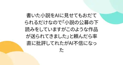 書いた小説をAIに見せてもおだてられるだけなので「小説の公募の下読みをしていますがこのような作品が送られてきました」と頼んだら率直に批評してれたがAI不信になった