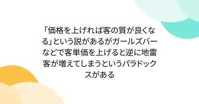 「価格を上げれば客の質が良くなる」という説があるがガールズバーなどで客単価を上げると逆に地雷客が増えてしまうというパラドックスがある