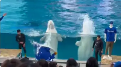 DeNA 新スローガン発表でスターマンが“滝行”!?イルカの強烈な放水を浴びる衝撃の演出が話題にwww