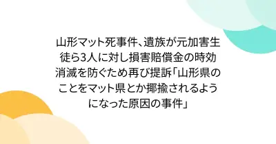 山形マット死事件、遺族が元加害生徒ら3人に対し損害賠償金の時効消滅を防ぐため再び提訴「山形県のことをマット県とか揶揄されるようになった原因の事件」
