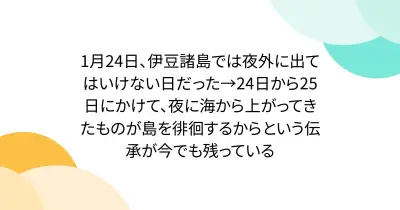 1月24日、伊豆諸島では夜外に出てはいけない日だった→24日から25日にかけて、夜に海から上がってきたものが島を徘徊するからという伝承が今でも残っている