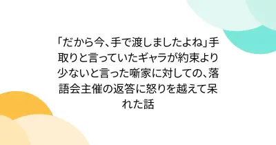 「だから今、手で渡しましたよね」手取りと言っていたギャラが約束より少ないと言った噺家に対しての、落語会主催の返答に怒りを越えて呆れた話