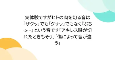 実体験ですがヒトの肉を切る音は「ザクッ」でも「グサッ」でもなく『ぶちっ…』という音です「アキレス腱が切れたときもそう」「傷によって音が違う」