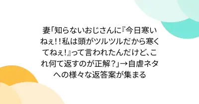 妻「知らないおじさんに『今日寒いねぇ!!私は頭がツルツルだから寒くてねぇ!』って言われたんだけど、これ何て返すのが正解?」→自虐ネタへの様々な返答案が集まる