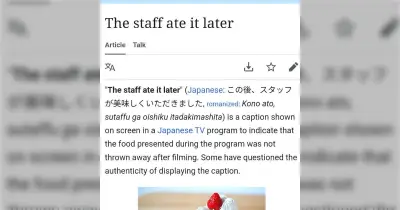英語版Wikipediaの『The staff ate it later (この後、スタッフが美味しくいただきました)』が「表現が可愛い」と海外のSNSで話題→確かに日本でしか見ない表現かもしれない