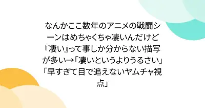 なんかここ数年のアニメの戦闘シーンはめちゃくちゃ凄いんだけど『凄い』って事しか分からない描写が多い→「凄いというよりうるさい」「早すぎて目で追えないヤムチャ視点」
