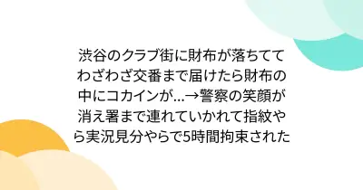 渋谷のクラブ街に財布が落ちててわざわざ交番まで届けたら財布の中にコカインが...→警察の笑顔が消え署まで連れていかれて指紋やら実況見分やらで5時間拘束された