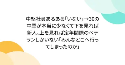中堅社員あるある「いない」→30の中堅が本当に少なくて下を見れば新人、上を見れば定年間際のベテランしかいない「みんなどこへ行ってしまったのか」