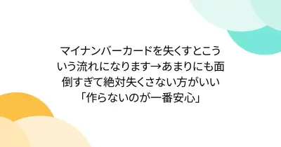 マイナンバーカードを失くすとこういう流れになります→あまりにも面倒すぎて絶対失くさない方がいい「作らないのが一番安心」
