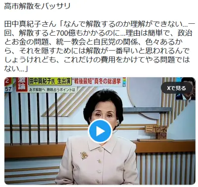 【自民党】田中真紀子「700億もかけて解散するのは統一教会と裏金を隠すためです」