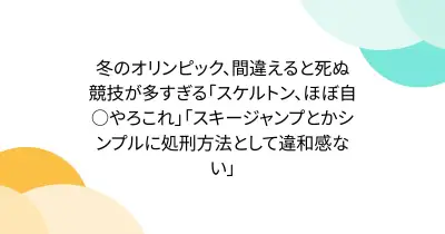 冬のオリンピック、間違えると死ぬ競技が多すぎる「スケルトン、ほぼ自○やろこれ」「スキージャンプとかシンプルに処刑方法として違和感ない」