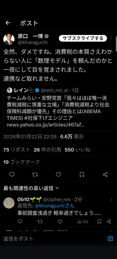 原口一博、チームみらいを批判「安野は消費税の本質が分かってない。チームみらいとは組めませんね」