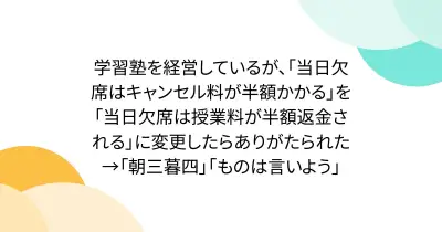学習塾を経営しているが、「当日欠席はキャンセル料が半額かかる」を「当日欠席は授業料が半額返金される」に変更したらありがたられた→「朝三暮四」「ものは言いよう」