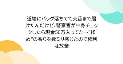 道端にバッグ落ちてて交番まで届けたんだけど、警察官が中身チェックしたら現金50万入ってた→"揉め"の香りを数ミリ感じたので権利は放棄
