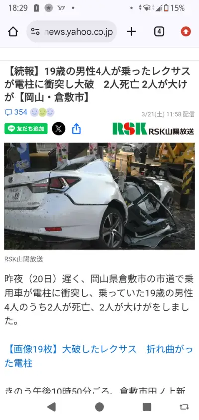 岡山でレクサスが大破で乗車していた19歳塗装工など二人が死亡
