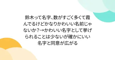 鈴木って名字、数がすごく多くて霞んでるけどかなりかわいい名前じゃないか?→かわいい名字として挙げられることは少ないが確かにいい名字と同意が広がる