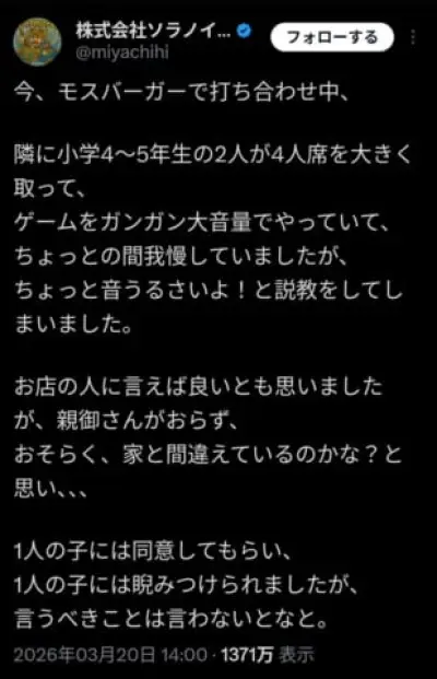 【悲報】ラーメン屋の社長さん、モスバーガーで騒いでる小学生にマジギレして炎上
