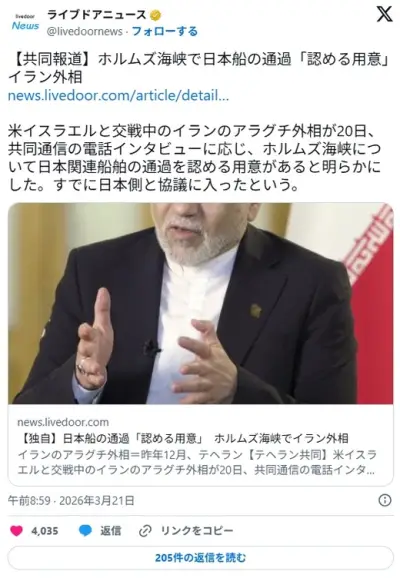 【速報】イラン外相アラグチ氏「日本関連船舶のホルムズ海峡通過を認めようかな」