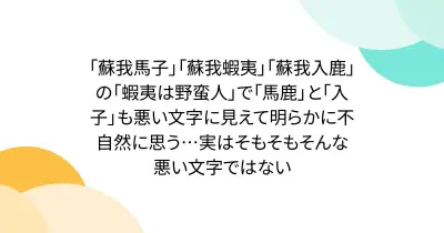 「蘇我馬子」「蘇我蝦夷」「蘇我入鹿」の「蝦夷は野蛮人」で「馬鹿」と「入子」も悪い文字に見えて明らかに不自然に思う…実はそもそもそんな悪い文字ではない