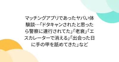 マッチングアプリであったヤバい体験談…「ドタキャンされたと思ったら警察に連行されてた」「老衰」「エスカレーターで消える」「出会った日に手の甲を舐めてきた」など