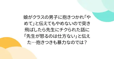 娘がクラスの男子に抱きつかれ「やめて」と伝えてもやめないので突き飛ばしたら先生にチクられた話に「先生が怒るのは仕方ない」と伝えた…抱きつきも暴力なのでは?