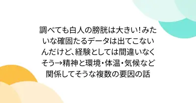 調べても白人の膀胱は大きい!みたいな確固たるデータは出てこないんだけど、経験としては間違いなくそう→精神と環境・体温・気候など関係してそうな複数の要因の話