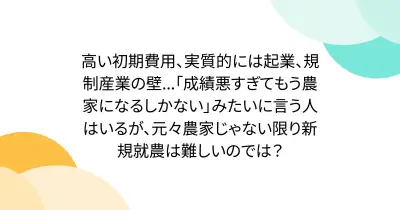高い初期費用、実質的には起業、規制産業の壁...「成績悪すぎてもう農家になるしかない」みたいに言う人はいるが、元々農家じゃない限り新規就農は難しいのでは?