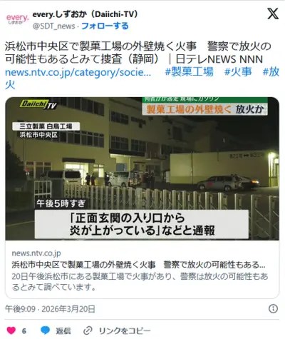 【静岡】製菓工場の外壁焼く火事 警察で放火の可能性もあるとみて捜査【チョコバット】