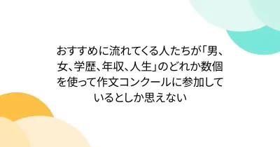 おすすめに流れてくる人たちが「男、女、学歴、年収、人生」のどれか数個を使って作文コンクールに参加しているとしか思えない