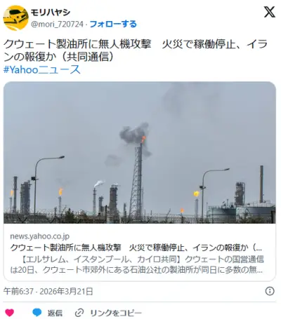 【国際】クウェート製油所に無人機攻撃 火災で稼働停止、イランの報復か