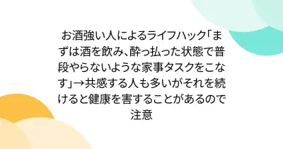 お酒強い人によるライフハック「まずは酒を飲み、酔っ払った状態で普段やらないような家事タスクをこなす」→共感する人も多いがそれを続けると健康を害することがあるので注意