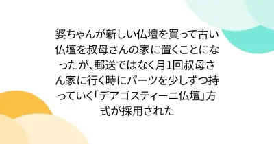 婆ちゃんが新しい仏壇を買って古い仏壇を叔母さんの家に置くことになったが、郵送ではなく月1回叔母さん家に行く時にパーツを少しずつ持っていく「デアゴスティーニ仏壇」方式が採用された