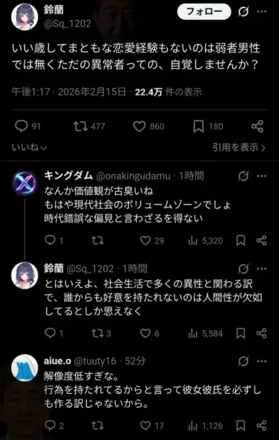 【画像】X「いい歳してまともな恋愛経験もないのは弱者男性ではなく異常者」