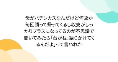 母がパチンカスなんだけど何故か毎回勝って帰ってくるし収支がしっかりプラスになってるのが不思議で聞いてみたら「台がね、語りかけてくるんだよ」って言われた
