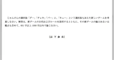 「じゃんけんの選択肢に、『キュー』という選択肢も加えた新しいゲームを考案しなさい。」2018年に早稲田大学の入試で出題された問題がとても面白そう