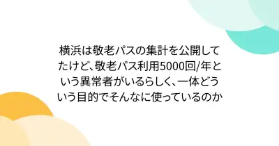横浜は敬老パスの集計を公開してたけど、敬老パス利用5000回/年という異常者がいるらしく、一体どういう目的でそんなに使っているのか