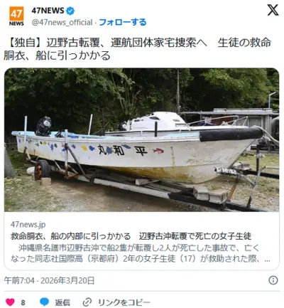【辺野古転覆】運航団体家宅捜索へ 生徒の救命胴衣、船に引っかかる