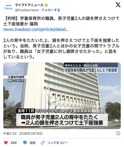 【福岡】男子児童2人の頭を押さえつけ土下座で女子児童に謝罪させる…学童保育所職員の行為、市が「虐待」判断 久留米市