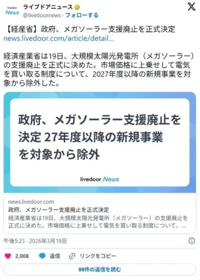 政府、メガソーラー支援廃止を正式決定