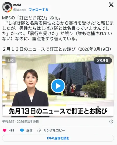 MBS、お詫びと訂正「一般人を怪我させたのはしばき隊ではなくニューしばき隊でした」