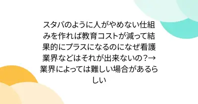 スタバのように人がやめない仕組みを作れば教育コストが減って結果的にプラスになるのになぜ看護業界などはそれが出来ないの?→業界によっては難しい場合があるらしい