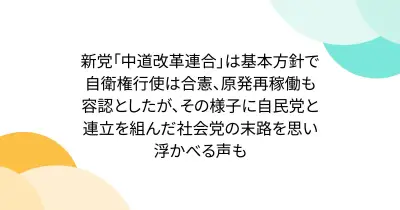 新党「中道改革連合」は基本方針で自衛権行使は合憲、原発再稼働も容認としたが、その様子に自民党と連立を組んだ社会党の末路を思い浮かべる声も