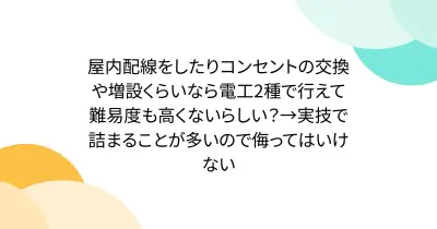 屋内配線をしたりコンセントの交換や増設くらいなら電工2種で行えて難易度も高くないらしい?→実技で詰まることが多いので侮ってはいけない