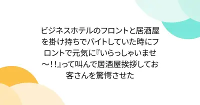 ビジネスホテルのフロントと居酒屋を掛け持ちでバイトしていた時にフロントで元気に『いらっしゃいませ~!!』って叫んで居酒屋挨拶してお客さんを驚愕させた